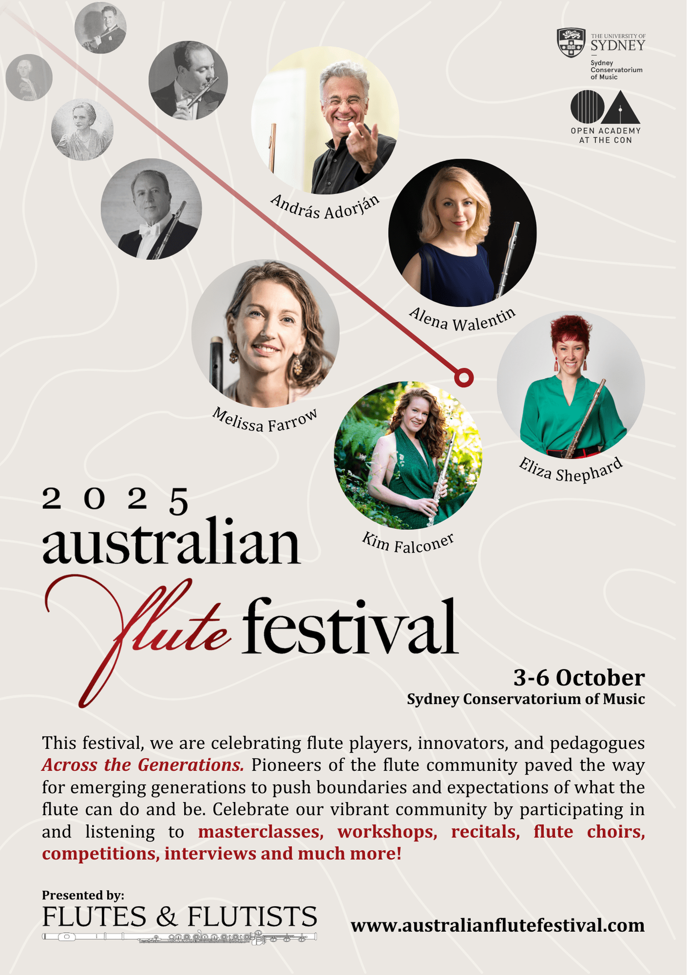 Mark your calendars for the 2025 Australian Flute Festival, taking place from 3–6 October at the Sydney Conservatorium of Music. This year’s theme, “Across the Generations,” honours the flautists, innovators, and educators whose contributions continue to shape and inspire the flute community.