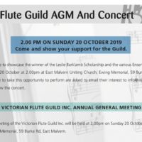 The Victorian Flute Guild held its Annual General Meeting and concert on Sunday 20 October 2019 at 2:00 PM at East Malvern Uniting Church, Ewing Read More …