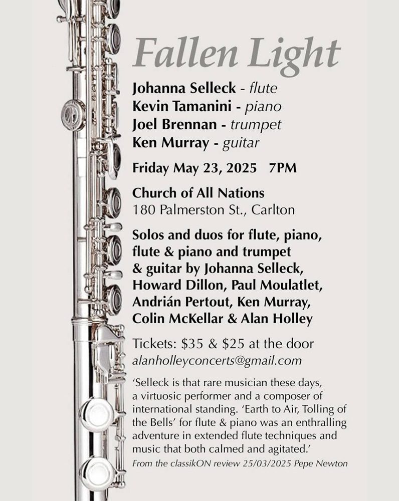 This richly textured program showcases solos and duos for flute, piano, trumpet, and guitar, with works by composers including Johanna Selleck, Howard Dillon, Paul Moulatlet, Andrián Pertout, Ken Murray, Colin McKellar, and Alan Holley.